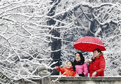 1月28日,游客在江苏省淮安市盱眙县第一山公园观赏雪景。近日,我国中东部迎来今年以来范围最广、持续时间最长的雨雪天气,陕西、河南、湖北、安徽等多省有暴雪。 (新华社发)