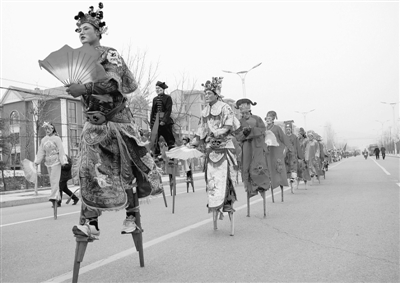 2月25日,民俗队员在山亭区府前路上表演踩高跷。