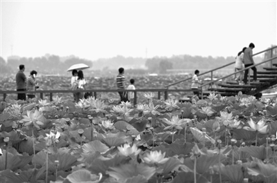 ➝国家统计局2015年2月26日发布的《中华人民共和国2014年国民经济和社会发展统计公报》显示,2014年我国国内游客36.1亿人次,比上年增长10.7%,国内旅游收入30312亿元,增长15.4%。图为2014年7月6日,游客在河北省白洋淀景区荷花大观园参观游览。(新华社记者 朱旭东 摄)