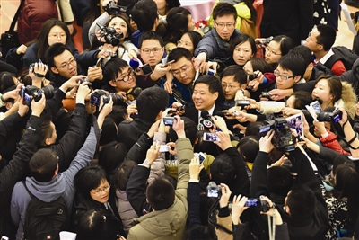 ➝3月3日,中国人民政治协商会议第十二届全国委员会第三次会议在北京人民大会堂开幕。这是记者们争相采访全国政协委员朱光耀。 (新华社记者 李鑫 摄)