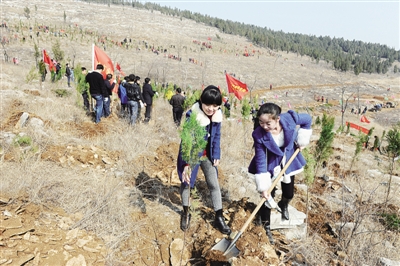 3月11日,团市委组织团员青年开展“青春绿色行动 共建美丽枣庄”青少年植树活动,11000余名团员青年参加,现场栽植5000余棵,以实际行动为创建国家园林城市做贡献。 (记者 刘品 摄)