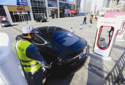 ➝3月25日,一辆特斯拉轿车在沈阳首个特斯拉超级充电站充电。