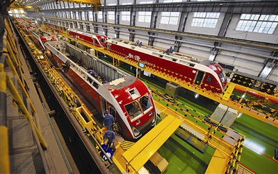 南车株机总装车间内组装中的机车组(3月27日摄)。如果一切进展顺利,南北车的合并最快可在今年6月份完成。自去年底宣布将合并成立中国中车以来,南北车的合并一直在不断推进。合并后,中国轨道交通装备制造商将合力开拓海外市场,推动中国装备走出去,打造“中国制造”的高端形象。 (新华社发)