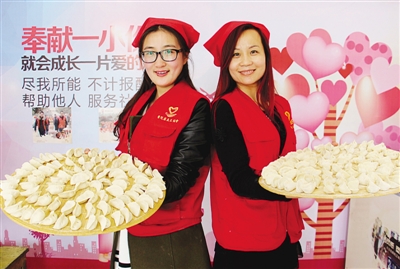 3月28日,义工在“爱心水饺店”展示爱心水饺。
