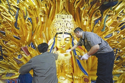 3月31日,在重庆市大足区宝顶山千手观音造像修复工程现场。目前,重庆大足千手观音造像修复工程的石质、彩绘和贴金等主体修复均已完成,修复工程进入最后的“护肤”阶段。按照计划,修复后的千手观音造像将于2015年6月正式竣工,与游客见面。 新华社发(罗国家 摄)