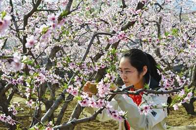4月6日,游客在河北顺平县伊祁山桃园赏花拍照。