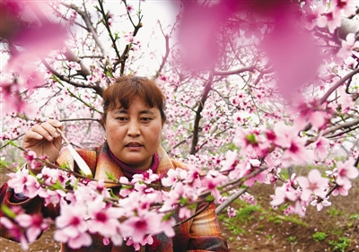4月5日,水泉镇尚岩村妇女为大红桃进行人工授粉。当日是二十四节气中的清明,山亭区千亩大红桃基地繁花似锦,果农们忙着为盛花期的桃树进行人工授粉,到处是一派繁忙景象。 (刘明祥 摄)