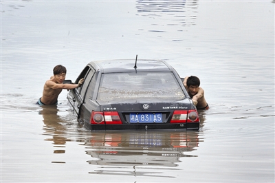 4月7日,长沙两名男子将一辆被水淹的汽车推出来。当日,湖南长沙遭遇暴雨袭击,城区多处出现严重内涝,部分街道成“泽国”,一些机动车路过积水路段因熄火抛锚被水淹。湖南省气象台预计,未来一周长沙持续降温降雨,局地将出现雷暴、短时暴雨等对流性天气。(新华社发)