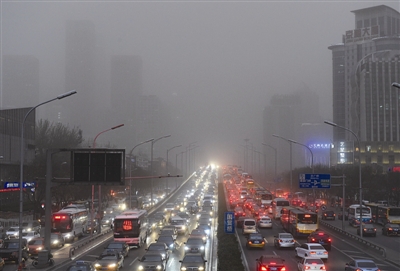 4月15日下午6点40分左右,北京东三环一带沙尘弥漫。