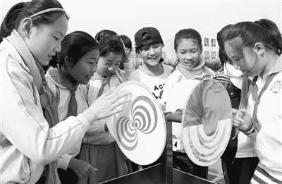 日前,青岛水族馆科普大篷车山东巡回展来到台儿庄区实验小学,让学生们零距离感受大海的气息,观察到以往只能在书本上或电视上看到的科技模型、海洋生物标本。图为工作人员指导学生体验“磁力线演示”仪器装置。 (张严新 贾传武 摄)