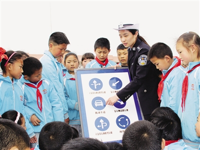 近日,台儿庄区交警大队组织民警,到偏远山区学校开展“交通安全进校园”活动。交警通过宣传图板向学生讲解交通标志和救护箱使用等,引导学生树立交通安全意识,提高自我保护能力。图为交警在教学生识别交通标识。