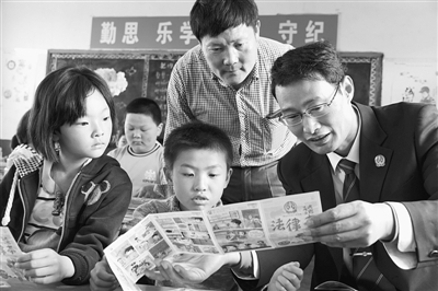 4月24日,山亭区法院法官满建农(右)在指导水泉镇东堌城小学学生阅读法制读物。当日,山亭区法院少年法庭的4名法官来到大山深处的东堌城小学,开展“加强自我保护意识,自觉抵制违法犯罪”主题教育活动,让学生们零距离感知少年法庭,从小树立法制意识和自我防范意识。 (刘明祥 王涛 摄)