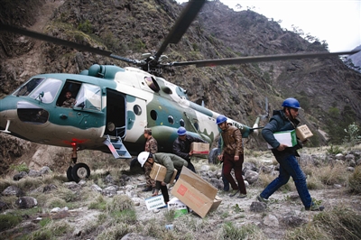 当日下午,成都军区某陆航旅出动三架次直升机前往尼泊尔境内,向中国长江三峡集团公司旗下的中国水电七局正在参加尼泊尔那苏瓦卡里水电站项目建设的工程人员送去水和食物,并接回部分中方人员。 (新华社发)