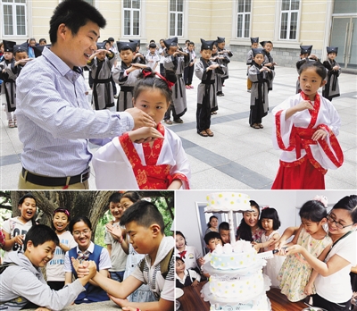 图①:5月27日,山亭区实验小学的孩子们在区文化馆里学习中国古代“拜师礼”。孩子们身着汉服,齐诵国学经典,接受传统文化熏陶。 (孙海锋 摄)