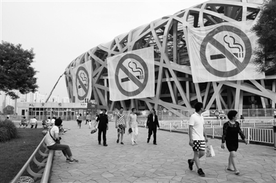 6月1日,国家体育场“鸟巢”悬挂起巨幅禁烟标志。当日,被称为“史上最严禁烟令”的《北京市控制吸烟条例》正式施行。该条例规定,公共场所、工作场所的室内区域以及公共交通工具内禁止吸烟,包括幼儿园、中小学校、文物保护单位、体育场、儿童医院在内的室外区域也禁止吸烟。违反条例将被处以个人最高200元人民币、单位最高1万元的罚款。 (新华社发)