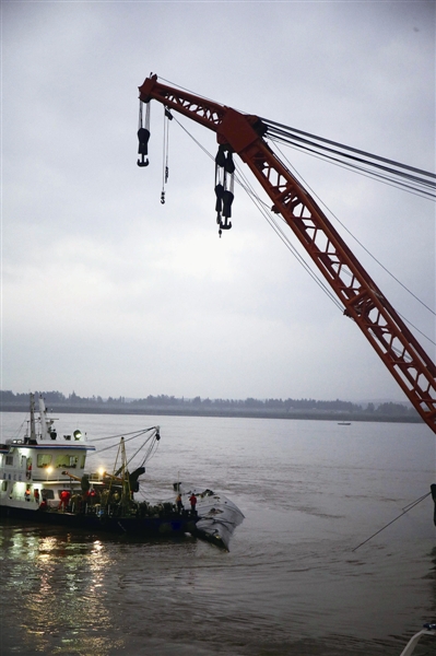 6月2日傍晚拍摄的救援现场。6月1日晚,从南京驶往重庆的客船“东方之星”轮在长江中游湖北监利水域发生翻沉。据初步统计,事发客船共有456人,其中旅客405人。目前搜救工作正在紧张进行。 (新华社发)
