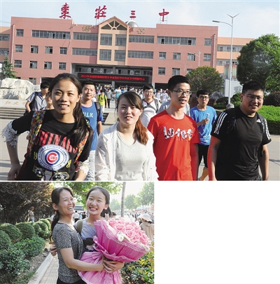 左图:考场外等候的家人迎上前,为考生送上拥抱和鲜花。 (记者 赵宁 摄)