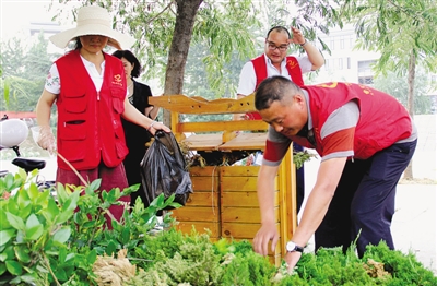 6月10日,义工在台儿庄古城大桥停车场捡拾垃圾。夏季来临,台儿庄义工协会与台儿庄古城联合开展了“手牵手共创文明、心连心同爱古城”为主题的志愿服务活动,以实际行动倡导市民和游客养成文明的生活方式。(张严新 摄)