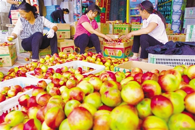6月8日,水泉镇农民在果品市场分装甜油桃。今年,山亭区水泉镇积极推广叶面施肥、果园滴灌、生物治虫等多项措施,加之光照充足,8500亩甜油桃喜获丰收。无公害甜油桃个大色艳、甜脆可口又耐贮运,成为各地客商的抢手货。 (刘明祥 摄)