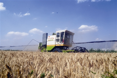 图为联合收割机在山东省茌平县贾寨镇耿张村收割小麦(6月13日摄)。