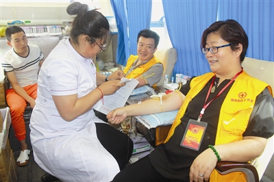 6月14日,滕州市步行街的采血车上市民和志愿者正在献血。当日是世界献血者日,今年的主题是“感谢您挽救我的生命”,到当天下午5时已有160多名市民和志愿者参与无偿献血。 (侯志龙 摄)