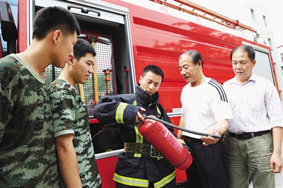 图为消防官兵正在讲解如何使用干粉灭火器。 (记者 刘品 摄)