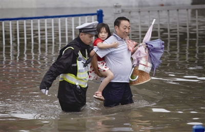 ←6月17日,在上海市嘉定区南翔镇,一名交警帮助市民趟过积水路段。当日,上海遭遇暴雨天气,部分街区、路段积水严重。 (新华社发)