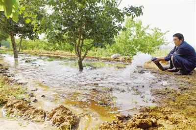 自五月中旬至今,我市降水量较常年明显偏少,全市大部区市出现40年一遇的春夏连旱的特大旱情。近期,针对持续高温少雨、旱情持续发展的不利形势,各区市采取多项措施,全力战旱魔保增收,力争将旱情对农业生产造成的损失降到最低。图为6月13日,山亭区水泉镇村民在浇灌樱桃树。 (刘明祥 摄)