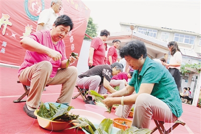 6月20日,铁西社区居民在参加包粽子比赛。端午节当天,市中区中心街道铁西社区开展第五届邻里文化节活动,通过包粽子、踢毽子、趣味运动会等活动推动社区文化建设,丰富居民的文化生活,弘扬邻里互相帮助的社会风尚。 (梁秋实 摄)
