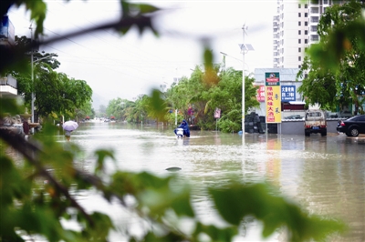 6月23日,在海南省三亚市,人们在积水路段涉水前行。今年第8号台风“鲸鱼”已于6月22日18时50分左右在海南省万宁市沿海登陆,台风给三亚带来了强风降雨天气,影响市民正常出行。 (新华社发)
