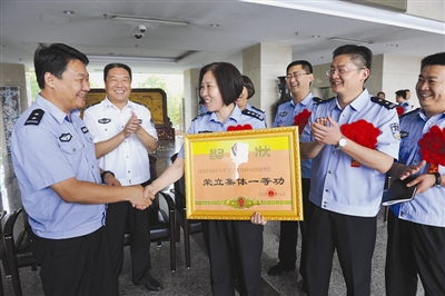 6月25日,公安部授予枣庄市公安局“6.04”生产、销售不符合安全标准食品案专案组集体一等功。“6.04”专案组经过八个多月深入细致的工作,成功侦破了非法从境外疫区走私到国内,横跨八省市违法销售、涉案价值1000余万元的巴西冻牛肉案。该案件被评为“食品药品十大典型案例”之一。图为授奖现场。 (孔猛 陶义 摄)