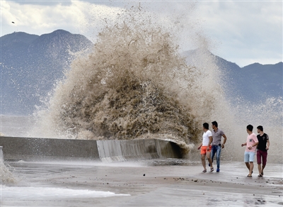 7月10日,福建霞浦三沙镇几位青年躲避巨浪。当日,2015年第9号台风“灿鸿”继续向闽浙沿海逼近,中心附近最大风力17级,福建沿海出现巨浪。福建省防汛抗旱指挥部于7月10日12时启动防台风Ⅱ级应急响应,要求各地继续做好海上人员撤离、地质灾害点人员转移及防御暴雨可能引发的次生灾害工作。 (新华社发)