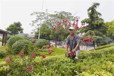 7月20日,园林工人正在沿河公园整修花草树木。今年以来,峄城区投资1200万元,对公园绿地、游园绿地、林荫路系统等七个方面进行绿化提升。目前城市绿地面积达432.74万平方米,人均公园面积达到13.61平方米,绿化覆盖率达36.22%。 (赵峰 摄)