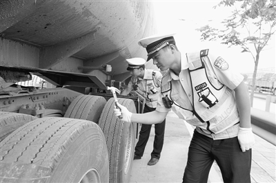 近日,市中公安分局交警大队联合交通运输局,开展为期两个月的集中治理运输车辆超限、超载专项行动,预防道路交通事故,保障夏季高温天气下的运输安全。图为7月22日,联合执法人员在对车辆进行安全检查。 (吉喆 吴敬安 摄)