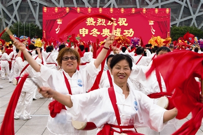 7月31日,市民在北京国家体育场“鸟巢”前庆祝北京携手张家口获得2022年冬奥会举办权。 (新华社发)