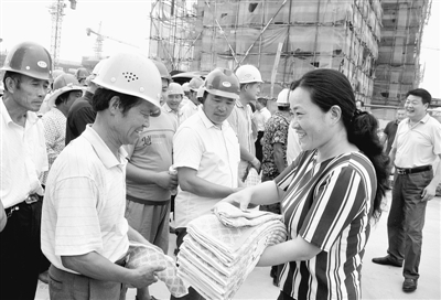 近日,山亭区总工会开展“夏送清凉”活动,为一线职工送去矿泉水、毛巾、西瓜等防暑降温用品,并现场发放安全施工、防暑、防雷手册,让广大职工度过一个安全、健康、清凉的夏季。 (孙海锋 摄)