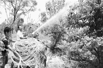 ←8月2日,果农正在蟠龙河沿岸为果树喷施农药。今年以来,薛城区本着政府引导为主,农户自愿发展的原则,积极推进土地流转,拓宽农民增收渠道。目前,已经完成蟠龙河沿线土地流转3000多亩,盛农家庭农场等农业特色基地建设已初具规模。 (刘品 甄再斌 摄)