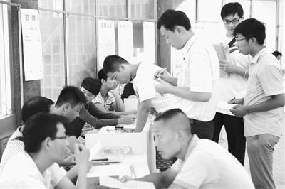 8月6日,高校毕业生在与招聘单位洽谈。当日,市中区举办2015年高校毕业生暨见习基地专场招聘会。此次招聘的岗位主要有市场专员、销售顾问、行政人事、技工等100余个工种,吸引众多高校毕业生前来洽谈,寻找自己理想的职业。 (实习生 孙杨 摄)