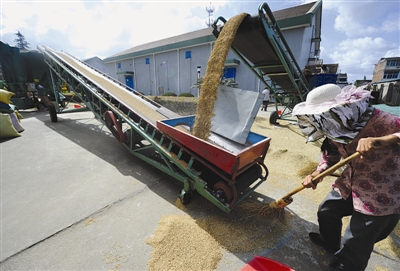8月7日,地处浙江东南沿海的温岭市中心粮库正在加紧早稻入库。当日中午12时,浙江防台风应急响应等级提升为Ⅱ级,为防止受今年第13号台风“苏迪罗”带来的暴雨大风影响,浙江各地加紧早稻入库,保障农民利益。受“苏迪罗”影响,未来5天,台湾、福建中北部沿海、浙江南部沿海、苏皖北部及大别山、黄山等地将出现特大暴雨。(新华社记者 王小川 摄)