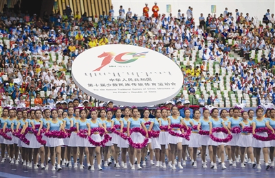 8月9日,第十届全国少数民族传统体育运动会开幕式在内蒙古鄂尔多斯举行。运动会期间,来自全国31个省(自治区、直辖市)、新疆生产建设兵团、解放军代表团以及台湾代表团共34个代表团的6240名运动员,将参加17项竞赛项目和178项表演项目的比赛。 (新华社记者 王鹏 摄)