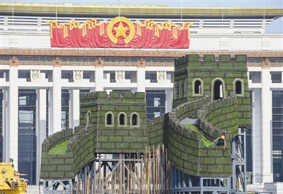 8月12日,天安门广场“长城”造型的主花坛初步成形。从8月10日开始,天安门广场及长安街沿线开始摆花。天安门广场、英雄纪念碑北侧布置主题花坛,长安街沿线布置200组花坛、2.5万平方米的花环,所有景观布置工作将在8月下旬完成。 (新华社记者 罗晓光 摄)
