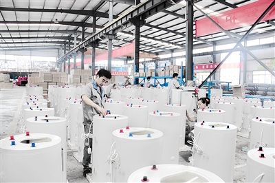 8月10日,在位于洪绪镇的中科蓝天科技有限公司内,一派繁忙景象,工人们顶着高温正在加紧生产。据了解,该公司是一家专业从事太阳能生产制造和市场推广于一体的高新技术企业,拥有数条澳洲全玻璃真空管自动化生产流水线和检测线,年生产量达20万台套,年销售收入过亿元。近期推出的阳台壁挂式太阳能热水器、中央系统集热模块系列,成为宾馆饭店、高档公寓、高层住宅用户的时尚选择。 (记者 金亮 通讯员 单智慧 摄)