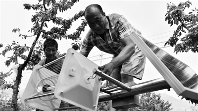 →8月14日,工作人员在棠棣峪村樱桃基地安装太阳能杀虫灯。近期,山亭区水泉镇将在万亩林果基地免费安装130盏太阳能杀虫灯,此种杀虫灯将太阳能转化为电能,利用昆虫的趋光、趋波、趋色等特性诱杀害虫,减少了农药的使用量,为果业发展撑起绿色“保护伞”。 (刘明祥 摄)