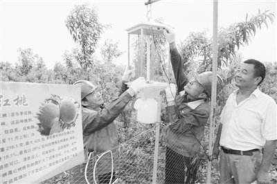 近日,薛城供电客服分中心彩虹共产党员服务队来到常庄镇小山村“绿之园”农庄、沙沟镇蓝莓种植基地、薛城区花卉苗木种植场,提供贴心周到的供电服务,保障特色农业种植户安全可靠用电。图为工作人员正在安装杀虫设备。 (王飞龙 褚培培 摄)