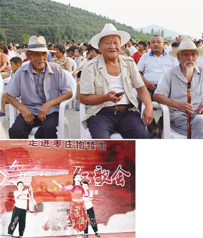 日前,“走进抱犊崮——纪念抗战胜利70周年”红歌会在抱犊崮景区举行,演员现场表演了《红星照我去战斗》、《红旗飘飘》等红色歌舞节目,传唱了中华民族英勇不屈的民族精神,赢得了受邀抗战老兵和千余位观众的阵阵掌声。上图:受邀抗战老兵观看节目。下图:红色歌舞表演。 (刘品 刘凤琦 摄)