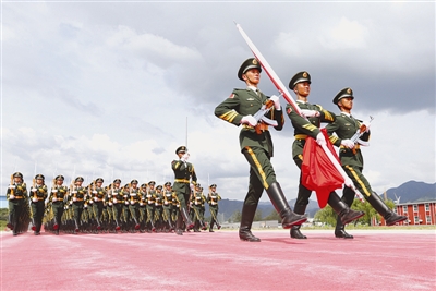 该护卫方队承担纪念大会升旗仪式的护卫任务,由200人组成。其中护旗方阵196人,升旗组4人,统一着新式武警升降旗礼服,穿马靴。护卫方队官兵平均身高1.85米,平均年龄22岁。据了解,该方队从今年6月份开始集中训练,每天训练十个半小时。 新华社发(牛成浩 摄)