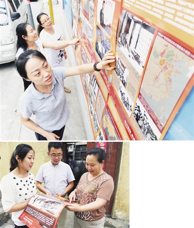 下图:社区网格员向居民讲解抗战胜利70周年宣传材料。