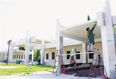 为纪念抗日战争胜利70周年,近日,薛城区园林处对铁道游击队纪念广场碑廊进行维修、保养。该碑廊陈列了我国近、现代大书法家和抗战英雄的书法碑刻,是铁道游击队纪念广场的主题景观。此次修缮工程主要对碑廊建筑墙面进行粉刷、修补,清除走廊两侧的杂草。 (王飞龙 王婧 摄)