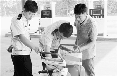 8月30日,市中区税郭镇安监部门工作人员正在加油站进行安全排查。连日来,为确保抗战胜利70周年阅兵期间安全生产形势稳定,税郭镇安监部门对辖区内十余家危化品经营场所进行专项整治,排查消除各种安全隐患。 (黄加芳 李抗抗 摄)