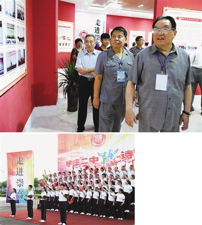 8月28日,由北京走进崇高研究院主办的纪念抗战胜利70周年暨“走进崇高”践行基地现场会在台儿庄区举行,参会人员走进校园参观纪念抗战胜利70周年爱国主义展览室,并举行爱国诗会以及“走进崇高”专题讲座,传承崇高文化,继承和发扬革命先烈精神。上图:参会人员参观现场会展览室。下图:枣庄二中师生举行爱国诗会。(记者 刘品 摄)